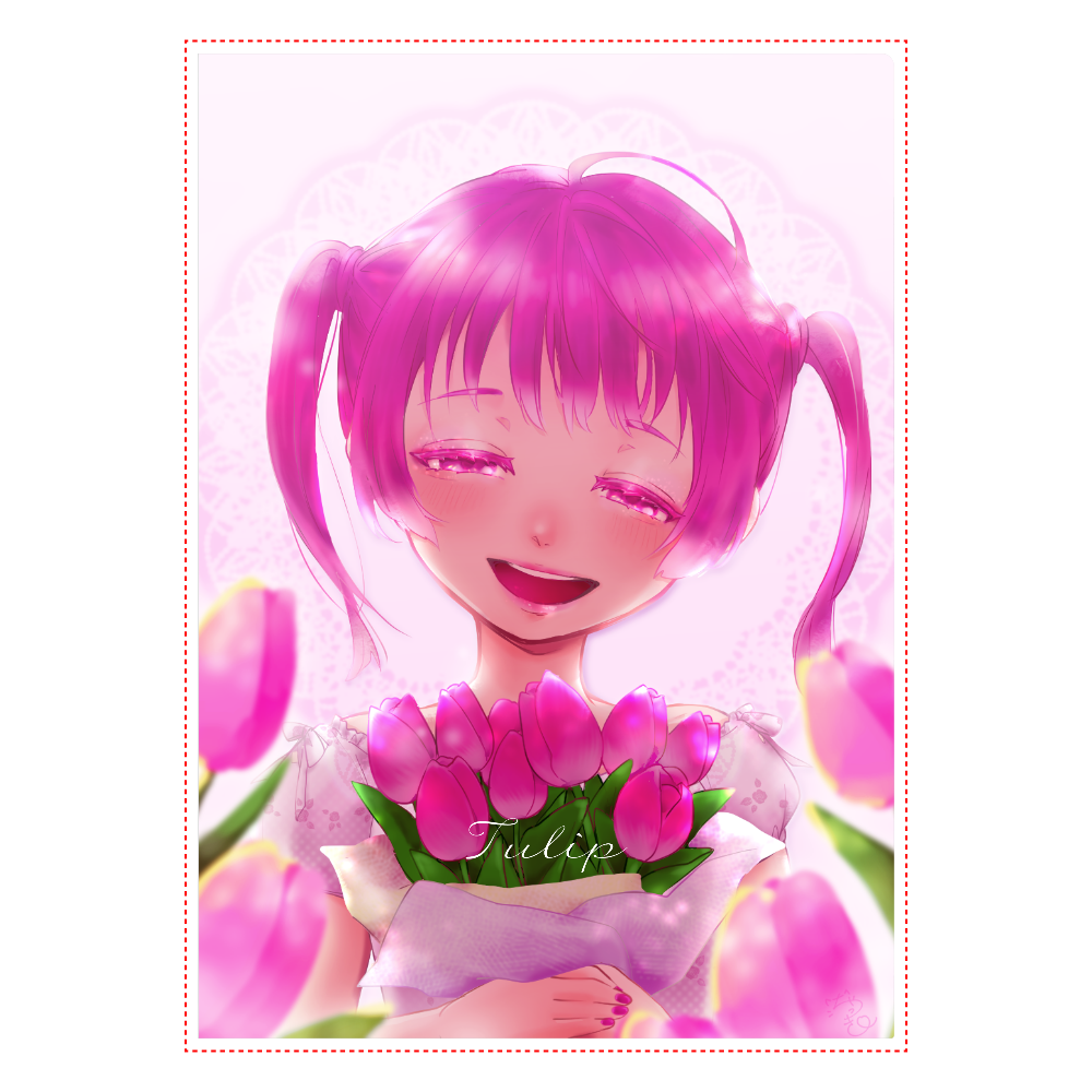 ピンクチューリップを抱えた女の子のクリアファイルです。 恋の芽生えがありますように。